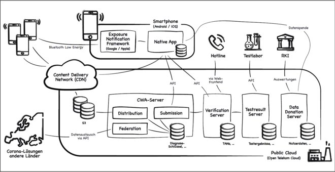 Abbildung 2 zeigt einen informellen Architekturüberblick der Gesamtlösung. Die Apps auf den Smartphones kommunizieren untereinander mit Bluetooth (BLE) und zusätzlich in Client-Server-Manier mit einem in Java realisierten Backend auf der Open Telekom Cloud. Die App-Nutzer erhalten Informationen über mögliche Begegnungen mit infizierten Personen. Sie verifizieren eigene Testergebnisse und warnen so freiwillig andere. Die Verifikations-Hotline unterstützt App-Nutzer bei der Freischaltung positiver Testergebnisse („teleTAN“). Gesundheitsämter und Testlabore liefern anonymisierte Testergebnisse an das System. Das Robert Koch-Institut (kurz RKI) stellt Inhalte („Content“) für die App zur Verfügung und bestimmt Parameter für die Messung der Kontakte („Risiko-Ermittlung“). Darüber hinaus empfängt das RKI Auswertungen, etwa aus der freiwilligen Datenspende. Der Austausch mit dezentralen Anwendungen anderer Länder ermöglicht die grenzüberschreitende Ermittlung von Begegnungen.
