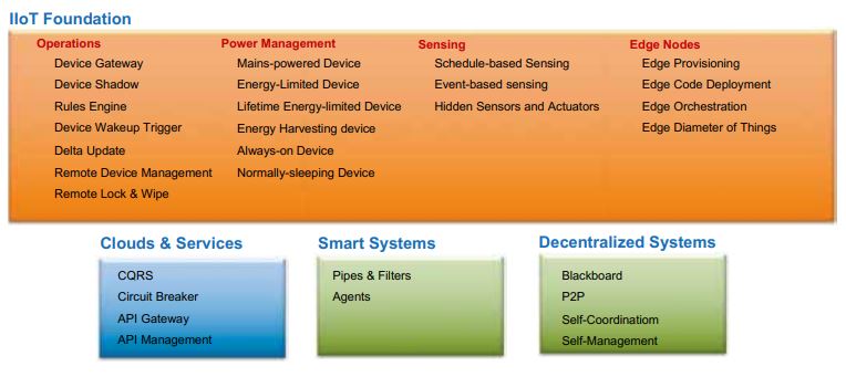 - IIoT-Foundation umfasst grundlegende Muster für Betrieb (Operations), Energieversorgung (Power Management), Messwerterfassung (Sensing) von verteilten IoT-Knoten sowie für Edge-Computing (Edge Nodes).