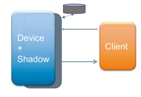 Lösung: Das System enthält Schattenobjekte, eines für jedes Gerät, dessen Zustand es persistent im Backend ablegt (s. Abb. 4). Aufrufer kommunizieren mit dem Schattenobjekt statt mit dem echten Gerät. Sobald das Gerät online geht, synchronisiert es sich mit seinem Schattenobjekt, nimmt dort gespeicherte Aufträge entgegen, führt diese aus, und legt seinen neuen Zustand persistent ab. Geht das Gerät offline, setzt es ein entsprechendes Flag im Schattenobjekt.