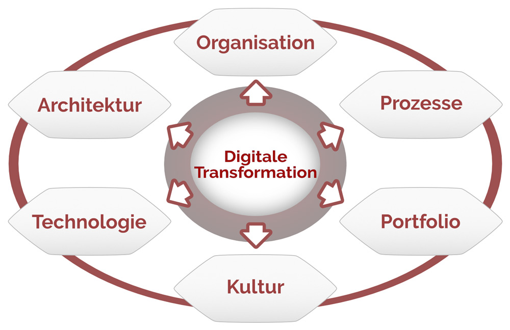 Abbildung 8 visualisiert die Zusammenhänge und mögliche Wege, die man je nach benötigtem Output (rote Hinweise an den Pfeilen) bestreiten kann, um in der vollen Transformationsbandbreite (Portfolio, Struktur, Prozesse, Kultur, Architektur, Technologie) passende Lösungswege zu finden.