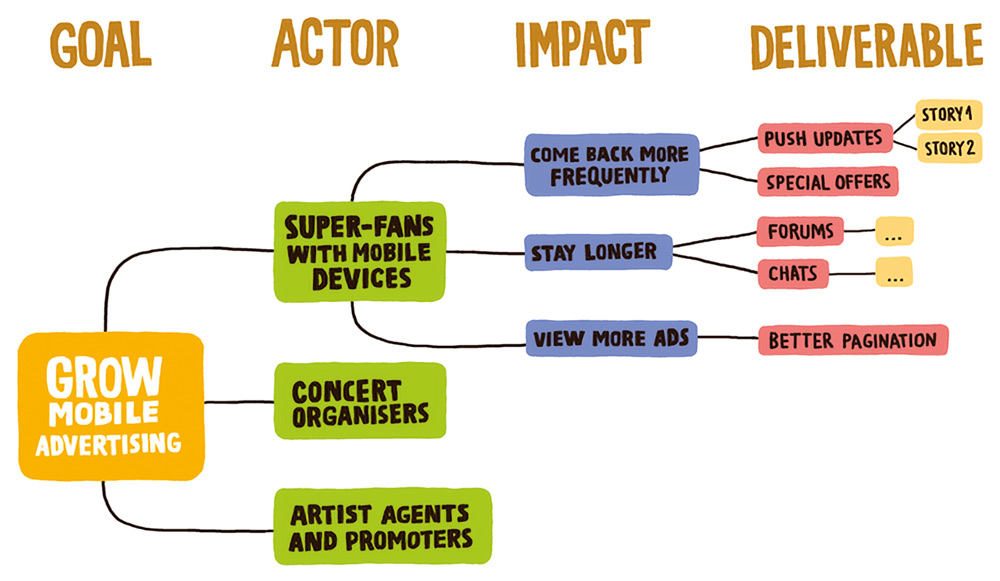 In nahezu allen Transformationsreisen spielt der Faktor Mensch beziehungsweise das Verhalten von unterschiedlichen Gruppen in der Interaktion miteinander eine wesentliche Rolle. Beispielsweise sind folgende Kulturbewegungen sehr häufig im Transformationskontext anzutreffen: DevOps-Kulturwandel, Agile Organisation, Feedbackkultur, Fehlerkultur, lebenslanges Lernen und viele weitere. Aber wie lassen sich Ziele für einen systemischen Wandel bestimmen und die resultierenden Kulturbewegungen mit motivierenden Maßnahmen oder Interventionen unterstützen? An dieser Stelle ist Impact Mapping (vgl. [Impac01]) eine sehr nützliche Herangehensweise. Die Methodik basiert wieder auf einer Baumstruktur und ist vergleichbar mit den Spielregeln, die wir bei den Critical to Quality Trees (CTQ) bereits diskutiert haben. Auch hier erarbeitet man sich die Ideen wieder in drei Stufen iterativ/inkrementell und widmet sich folgenden Themenstellungen (siehe Abbildung 7):