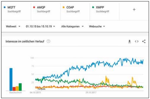 Die Verbreitung von MQTT zeigen Trends wie das „Eclipse Foundation IoT Survey“ [IoT19] oder auch eine aktuelle Google-Trends-Analyse (s. Abb. 1), die die Häufigkeit des Interesses am Protokoll über die verwendeten Suchbegriffe weltweit darstellt. Wer im Jahr 2019 ein IoT-Projekt umsetzen möchte, kommt an MQTT nicht vorbei.