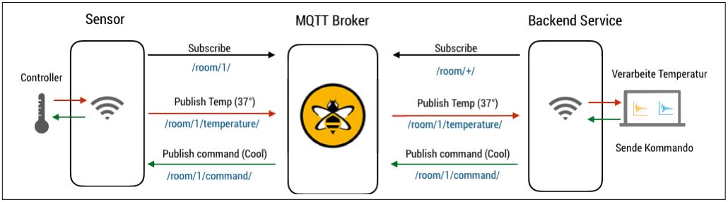 MQTT-Clients werden connected und auf das Command-Topic des jeweiligen Raumes für die Temperatur abonniert. Der Publish der Temperaturnachricht durch die Clients wird am Backend-Service, der mit dem Topic-Filter „room/+/temperature“ auf die Temperatur-Topics aller Räume abonniert ist, verifiziert und entsprechend verarbeitet.