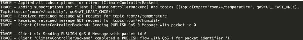 Die MQTT-Aktionen sind im Logfile des MQTT CLI und des HiveMQ Message Broker (Trace Level) sichtbar (s. Abb. 6).