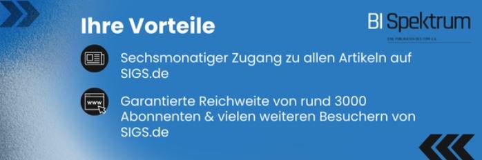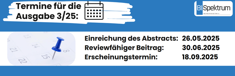 Wenn Sie einen eigenen Artikel für das BI-Spektrum 1/2026 schreiben oder einreichen möchten, senden Sie bitte Titel, Kurzbeschreibung (Abstract) des Inhalts und Autorenkurzbiografie bis zum 30.09.2025 an thomas.jannot@bi-spektrum.de. Wir melden uns dann kurzfristig bei Ihnen zurück, ob der Beitrag für eine Veröffentlichung infrage kommt. Ist der Vorschlag akzeptiert, senden Sie bitte den reviewfähigen Beitrag spätestens bis zum 17.11.2025 ebenfalls an thomas.jannot@bi-spektrum.de.