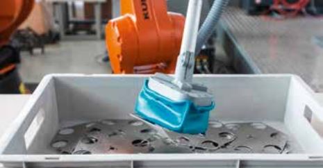 Abb. 1: Manche Werkstücke wie dünne glänzende Blechteile können dank maschinellem Lernen und einem neu entwickelten Greifer deutlich besser erkannt und gegriffen werden (Quelle: Fraunhofer IPA/Foto: Rainer Bez)