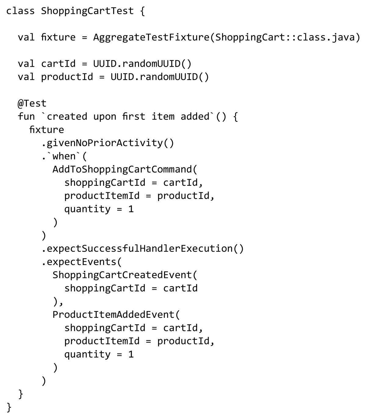 Die Umsetzung der Fachlogik wird somit auf zwei wesentliche Aspekte reduziert: die Prüfung der Gültigkeit des Commands anhand des aktuellen Aggregate-Zustands und die Protokollierung der Änderung in Form neuer Events. Diese Reduktion vereinfacht vor allem auch die Testbarkeit. Axon bietet dafür, wie in Listing 3 zu sehen, die sogenannte AggregateTest Fixture, welche im Given-When-Then-Stil den automatisierten Test eines Aggregates unterstützt.