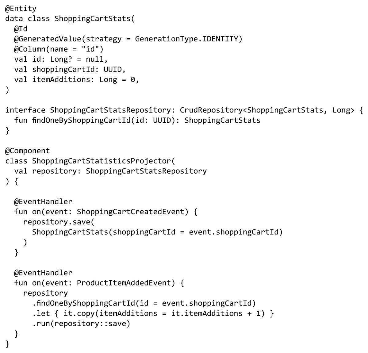 Die aus der Domänenlogik entstehenden Events werden nicht nur für die Rekonstruktion des Aggregate-Zustands herangezogen, sondern lassen sich mit Axon beliebig weiterverarbeiten. Man spricht hierbei auch von Projektionen, da die Events dabei in spezifische Read-Modelle überführt werden. Insofern sind die dafür verantwortlichen Event-Handler meistens technologiebehaftet und zählen streng genommen nicht zur Domänenlogik.