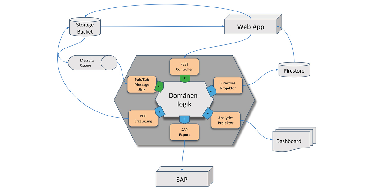 Abbildung 2 zeigt beispielhaft eine hexagonale Anwendungsarchitektur auf Basis von CQRS und Event Sourcing. Dabei handelt es sich um eine Webanwendung welche Commands per HTTP/REST überträgt und das resultierende Read-Modell vollständig über eine dokumentenbasierte Datenbank (Google Firestore) konsumiert. Weitere Ports und Adapter veranschaulichen die Kommunikation mit verschiedenen Umsystemen und Technologien.