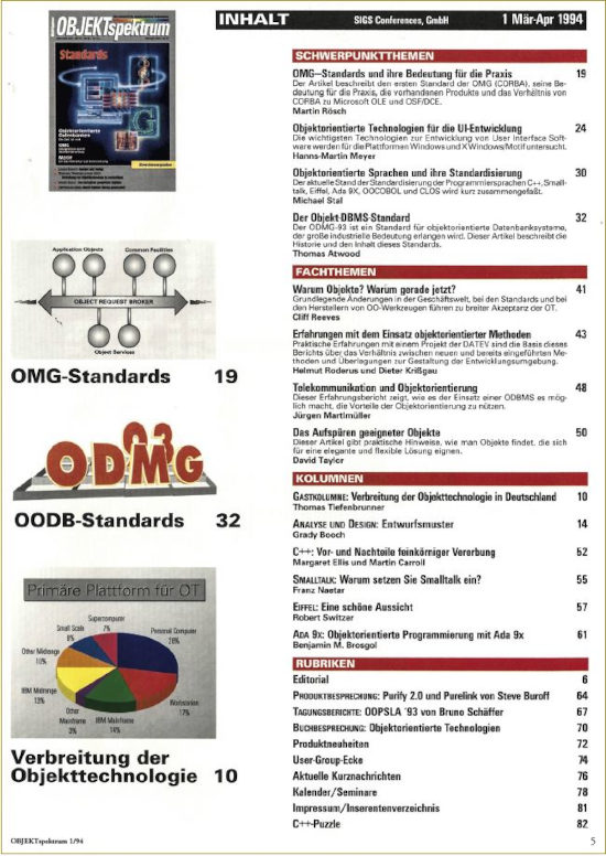 Wie man dem Inhaltsverzeichnis der ersten Ausgabe (siehe Abbildung 1) entnehmen kann, ging es in der OBJEKTspektrum zu Beginn auch um Objektorientierung in allen Facetten. Der Name war Programm.