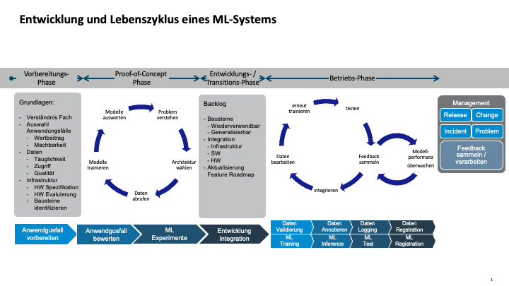 - In der Entwicklungs- und Transitions-Phase wird der Use-Case in eine betriebliche Umgebung eingebettet, die auch die notwendigen Prozesse für Betrieb und Weiterentwicklung umfasst.