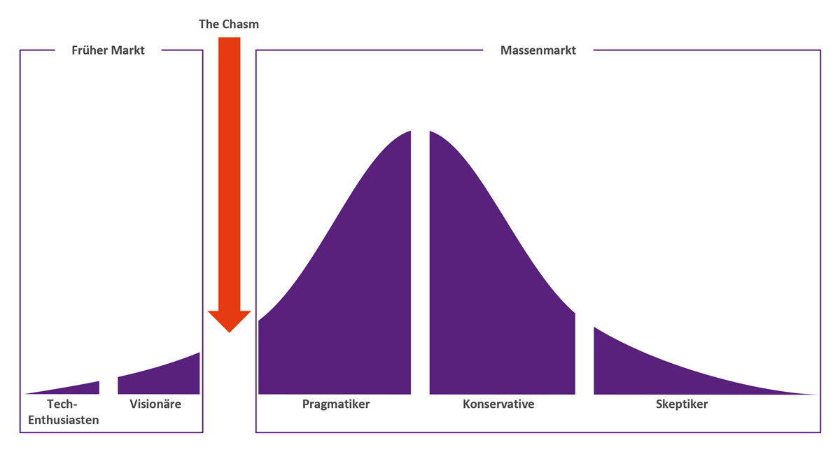 Wie in Abbildung 1 zu sehen ist, weist der Technology Adoption Life Cycle eine Glockenkurve auf, und die Unterteilungen in der Kurve entsprechen in etwa denen, in die die Standardabweichungen fallen würden. Dies bedeutet, dass Tech-Enthusiasten etwa 2,5 Prozent der Gesamtbevölkerung ausmachen, Visionäre etwa 13,5 Prozent, Pragmatiker und Konservative 34 Prozent und Skeptikerdie restlichen 16 Prozent. Jede Gruppe repräsentiert ein einzigartiges psychografisches Profil (dh eine Kombination aus psychologischen und demografischen Merkmalen), wodurch sich ihre Marketingreaktionen von denen der anderen Gruppen unterscheiden. Durch das Verständnis der Unterschiede dieser Gruppen können Produktmanager und Produktvermarkter alle diese Verbraucher mit den richtigen Marketingtechniken ansprechen. Der Technology Adoption Life Cycle zeigt eine Lücke, „the Chasm“ [B2U, Moo91], zwischen dem „Early Market“ und dem Massenmarkt. This Lücke gilt es für ein Produkt zu überkommen, um Fuß im Massenmarkt zu fassen, damit der Marktanteil weiterwächst und das Produkt ein Erfolg WIRD. Der Massenmarkt wird zunächst von den Pragmatikern bestimmt, gewinnt man diese, ist der Weg für eine Marktdominanz frei. Pragmatiker sind in der Regel Experten in ihrer Industrie und vertrauen einem Produkt nur, wenn es relevante Referenzen in der Industrie vorweisen kann.