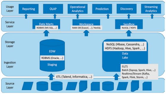 • Die Schichtenarchitektur orientiert sich sehr stark an der klassischen BI-Systemarchitektur. Allerdings spricht man bei der „Staging Area“ oder „Landing Zone“ nun vom „Ingestion Layer“. Dies begründet sich in der Tatsache, dass der Data Lake nur über eine zentrale Datenschicht verfügt (im Gegensatz zur Trennung im EDW in Staging Area und Core Data Warehouse).