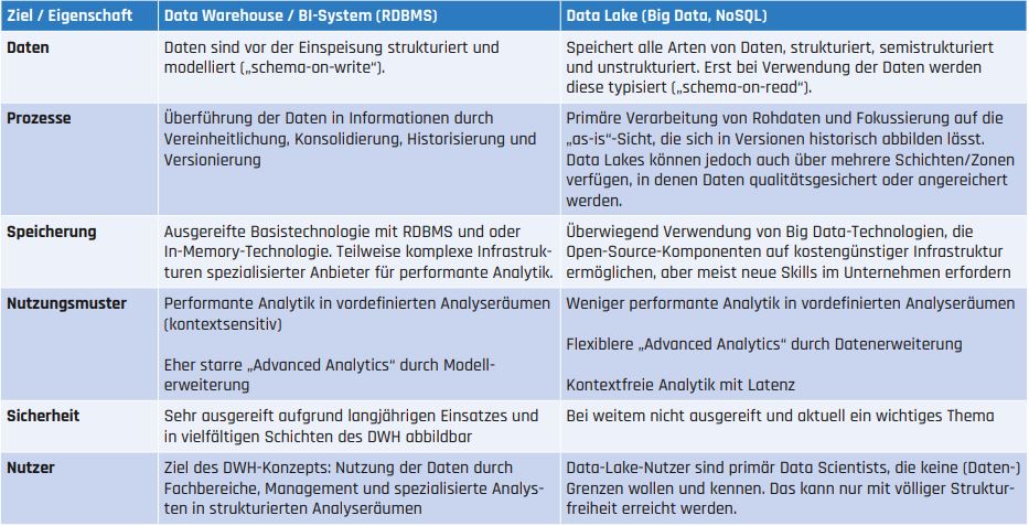 Vielfach ist zu hören, dass ein Data Lake nichts anderes als die Wiedergeburt des bekannten Data-Warehouse-Konzeptes sei, nur mit noch mehr Daten, neuen Datentypen/-arten und Techniken. Richtig ist, dass beide Konzepte im Grunde Daten-Repositories darstellen, die sich auf den ersten Blick ähneln. Tatsächlich verfolgen beide Ansätze ähnliche Ziele, haben aber komplementäre Eigenschaften und Methoden zur Zielerreichung, die in Tabelle 1 zusammengefasst sind.
