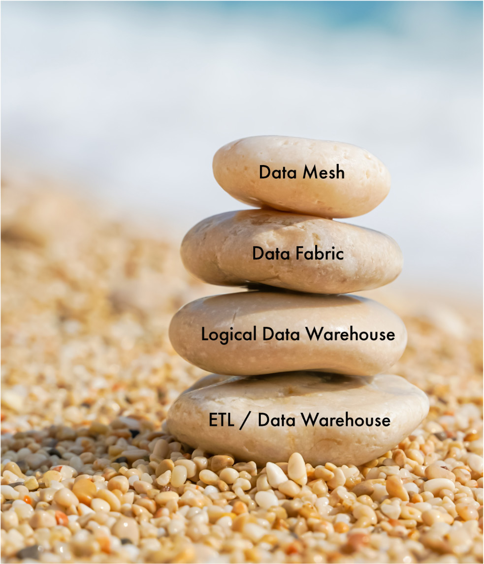 Mit alten Konzepten für Datenarchitekturen (zum Beispiel Data Lake, Data Warehouse) kann diese neue Systemlandschaft nicht mehr abgedeckt werden. Man braucht neue Konzepte und Ideen. So wird unter anderem von Gartner das Konzept „Data Fabric“ forciert (siehe unten).