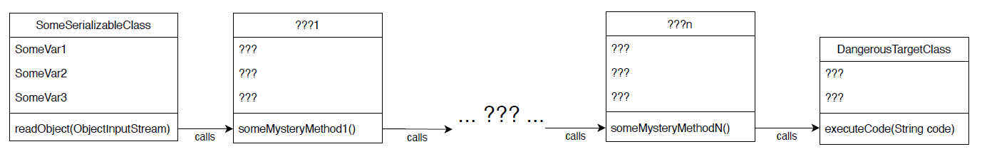 Doch der Aufruf einer readObject-Methode alleine wird dem Angreifer noch nicht helfen. Bei der Deserialisierung von den allermeisten Klassen, die selbst readObject implementieren, ist der Aufruf von readObject für den Angreifer nutzlos. Stattdessen muss der Angreifer eine Klasse finden und ein Objekt dieser Klasse konstruieren, die selbst die Interface-Methode readObject überschreibt und in deren eigener Implementierung Methoden anderer Klassen aufgerufen werden. Aber nicht irgendeine Methode einer beliebigen Klasse, sondern eine Methode, die wiederum eine Methode aufruft, die wiederum eine Methode aufruft ... die irgendwann eine Methode aufruft, die es erlaubt, beliebigen Code auszuführen, den der Angreifer in seinem serialisierten Java-Objekt untergebracht hat.