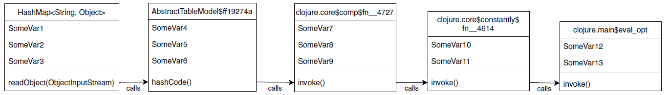 Ein Beispiel für eine valide Gadget Chain aus der Praxis zeigt Abbildung 3. Sie macht sich einen Mechanismus in Clojure (clojure. java.shell) zunutze, bei dem über einen Code-String wie "(use '[clojure.java.shell :only [sh]]) (sh %s)" beliebige Kommandozeilen-Befehle (auszufüllen an Stelle von %s) aus Java ausgeführt werden können. Diese Payload wird so in einem Objekt (genau genommen: einer HashMap) untergebracht, dass bei der Deserialisierung der HashMap und der enthaltenen Clojure-Objekte der Befehl über Umwege ausgeführt wird. Diesen Befehl kann der Angreifer nun nutzen, um den Server zu übernehmen, indem er ihn zum Beispiel anweist, einen Trojaner herunterzuladen und auszuführen oder eine Reverse Shell, also eine Kommandozeile, zu öffnen. Bei dieser Gadget Chain handelt es sich übrigens um eine der einfachsten. Viele Gadget Chains bestehen aus 10 bis 15 Objekten und ihren jeweiligen Methoden.