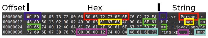 Ein Objekt mit age = 18 und name = "Hans" sieht im Speicher beispielsweise wie in Abbildung 1 aus. Verschiedene Bestandteile sind farblich markiert, sowohl in der Hex- wie auch in der String-Darstellung: Blau (oben links) ist der Header für serialisierte Java-Objekte mit Hex-Wert ACED. (Wenn man das Muster ACED oder, in Base64 codiert, rO0 irgendwo findet, ist dies ein guter Indikator für serialisierte Objekte, der einen aufhorchen lassen sollte.) In Rot markiert ist der Klassenname des Objekts (Person). Die Markierung für den Namen der ersten Member-Variablen (age) ist gelb und die der zweiten (name) ist grün. Von letzterer kann man sogar den Objekttyp java.lang.String (nicht farblich markiert) erkennen. Der Wert der age-Variablen ist in Magenta hervorgehoben (hexadezimal 00 00 00 12 entspricht dezimal dem Wert 18). Zu guter Letzt ist der Wert der name-Variable türkis hervorgehoben ("Hans").