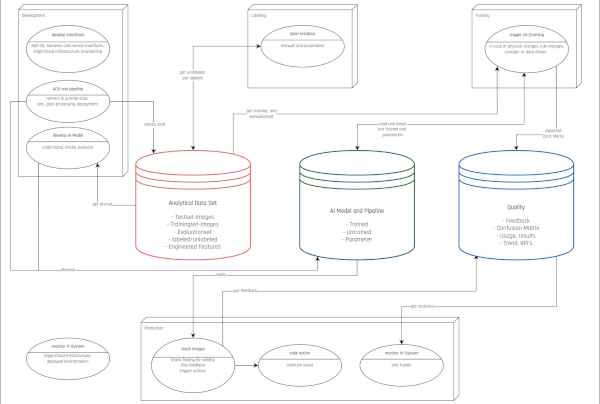 E-Check ermöglicht den iterativen Ansatz, um aus produktiven Daten zu lernen, indem die Daten in den Mittelpunkt gestellt werden. Die Umgebungen von Entwicklung über Training und Tests bis zur Produktivumgebung sind um die Daten gruppiert. Als Daten werden dabei alle Informationen betrachtet, die sich im Vorfeld in Piloten und im produktiven Prozess ergeben. Abbildung 1 zeigt, dass dies neben den Bildern aus der Anlage und den Ergebnissen eines aktuellen Release auch das Feedback der Mitarbeitenden, Trends in der Erkennung von Befunden beziehungsweise Ausreißer sind.