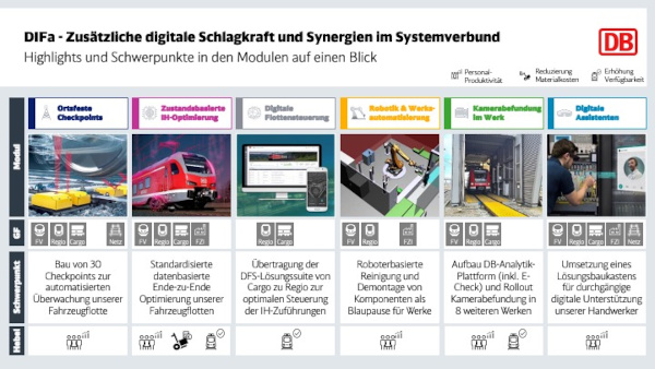 Vor diesem Hintergrund wurde 2021 das Konzernprogramm „Digitale Instandhaltung Fahrzeuge“, kurz DIFa, aufgesetzt. Thematisch zusammengehörende Projekte sind dabei in insgesamt sechs Modulen gebündelt, über die eine Ende-zu-Ende-Optimierung des Instandhaltungsprozesses sichergestellt ist.