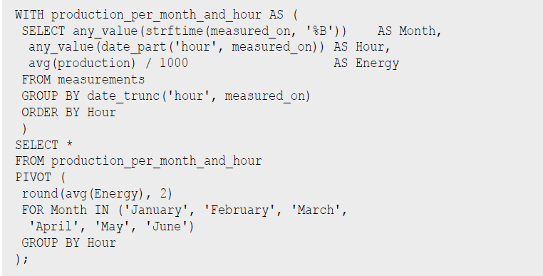 Auch SQL-Experten werden nicht enttäuscht, neben voller Unterstützung von Windows-Funktionen (OVER ... PARTITION BY), PIVOT sind auch Common Table Expressions in DuckDB an der Tagesordnung. Mein Kollege Michael Simons, der auch schon öfter Autor dieser Kolumne war, hat DuckDB genutzt, um die Erzeugungs- und Verbrauchsdaten seiner nagelneuen Photovoltaik-Anlage zu analysieren [SimonsPV]. Dabei war die Extraktion der Daten aus der Anbietersoftware der größte Aufwand, zwei interessante Beispielabfragen sind in Listing 10 und 11 zu sehen.