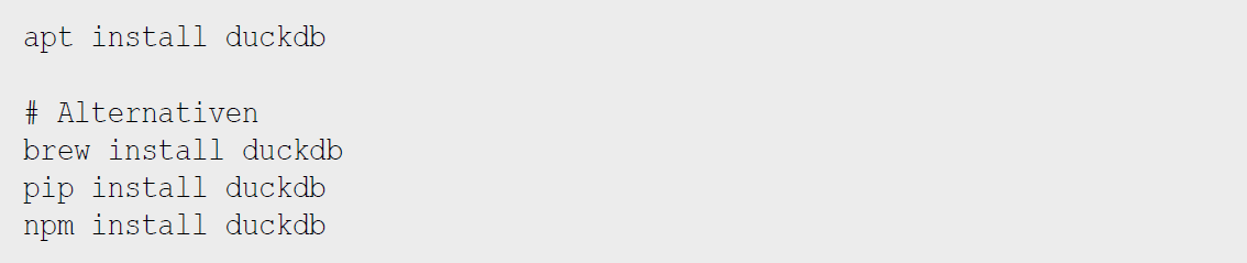 Aber genug der Einleitung, am besten machen wir uns gleich einmal mit DuckDB vertraut. Keine Angst, die Ente beißt nicht. Entweder per Paketmanager, Python Installer (pip) oder einfach per [Download] kann die kompakte Installation auf den eigenen Computer geholt werden (s. Listing 1).