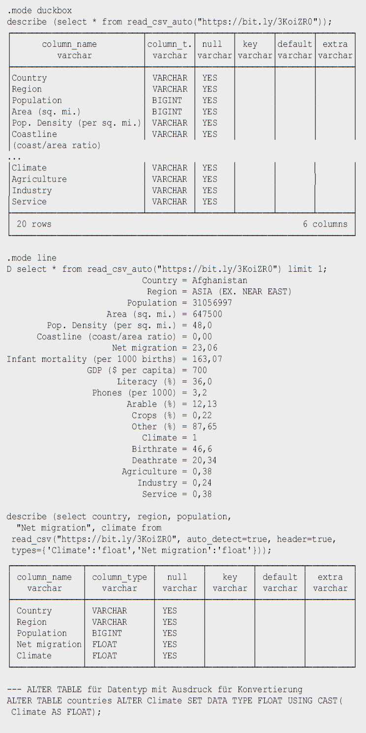 DuckDB hilft uns auch dabei, Metadaten von Tabellen zu untersuchen (describe) und zu modifizieren, siehe Listing 4. Mit read_csv_auto beziehungsweise read_csv(AUTO_DETECT=true) versucht DuckDB mittels einer Stichprobe die Datentypen der Spalten herauszufinden, fällt aber im Zweifelsfall auf Stringtypen VARCHAR zurück. Außer den Spalten Country und Region sollten aber alle anderen Spalten Integer- oder Dezimalzahlen sein.