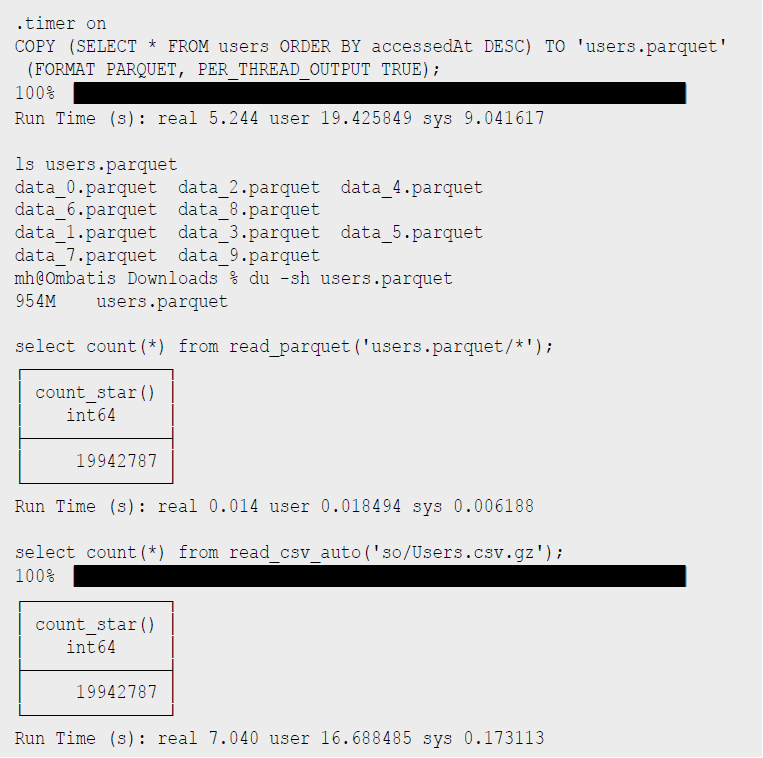 Wie wir sehen, bringen auch mittelgroße Datenmengen DuckDB nicht aus dem Gleichgewicht, für Tests mit Milliarden von Datensätzen wird oft der [NewYorkTaxi]-Datensatz benutzt, der im Parquet-Format vorliegt. Da CSV schon etwas in die Jahre gekommen ist, können wir die Daten auch nach Parquet exportieren, ein modernes Format für die analytische Datenverarbeitung (s. Listing 6). Für die 20 Millionen Nutzer dauert es 5 Sekunden, bis die 10 Dateien mit 1 G geschrieben sind. Das Lesen der Dateien ist jetzt viel schneller als von CSV.