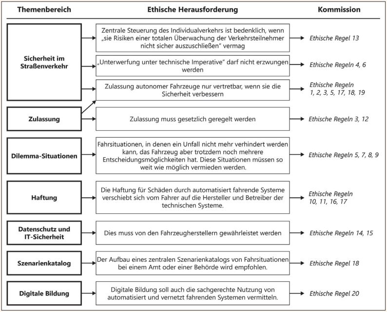 Experten aus den Bereichen Rechtswissenschaften und Kirche sowie Vertreter privater Vereine (ADAC) und der Automobilkonzerne (VW und Daimler) haben in einem ersten Schritt 20 konkrete ethische Regeln1 für den automatisierten und vernetzten Fahrzeugverkehr erarbeitet (siehe Abbildung 1). Diese sind nicht rechtlich bindend, dürften aber bei der Entstehung neuer Gesetze Berücksichtigung finden.