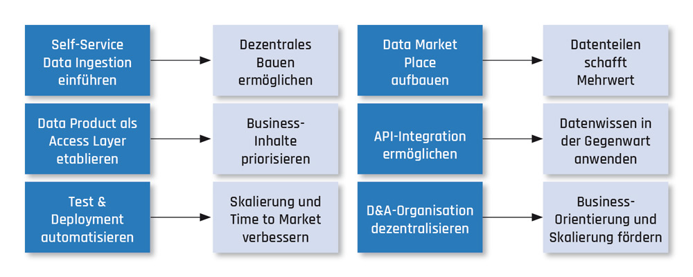Abbildung 4 zeigt eine Auswahl möglicher Schritte in Richtung Data Mesh. Diese können einzeln oder kombiniert eingesetzt werden, je nach Bedarf und Möglichkeiten einer Organisation. Sinnvoll ist die Erstellung einer Roadmap, die quartalsweise aktualisiert wird und die Modernisierungsschritte benennt sowie in eine zeitliche Abfolge bringt. Das schafft Transparenz über die Ambition und hilft beim Erwartungsmanagement mit den Stakeholdern.