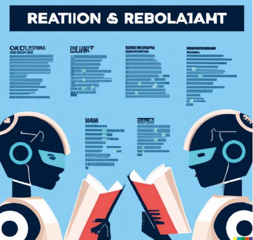 Abb. 1: „Humanoide Roboter, die Wörterbücher lesen, als Infografik“. Ein von der KI „DALL-E“ (OpenAI [Ope23b]) erzeugtes Bild für diesen Beitrag. Selbst für Experten ist schwer zu beschreiben und zu verstehen, wie dieses Bild zustande gekommen ist. Umso wichtiger ist bei Expertengesprächen, Missverständnisse selbst über elementare Begriffe zu vermeiden - nicht nur unter Robotern