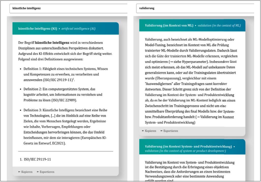 Abb. 2: Selbst identische Begriffe aus der Welt der KI können unterschiedliche Definitionen in verschiedenen Standards haben. Hier zwei Beispiele aus dem AI-Glossary [AIG23] mit Verweisen auf verschiedene Quellen (links der Begriff „KI“) oder in unter-schiedlichem Kontext (rechts der Begriff „Validierung“)