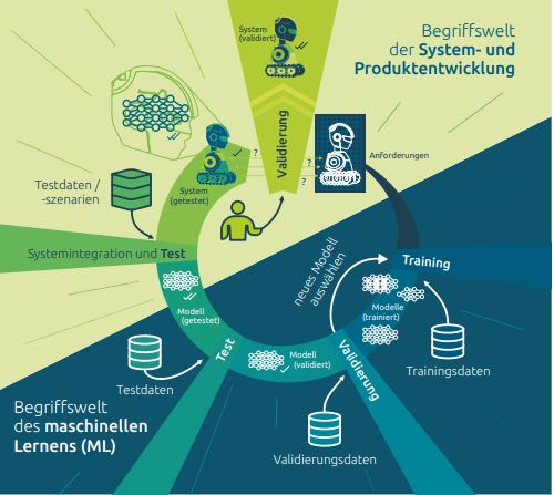 Diese Interpretation des Begriffs Validierung hat sich in der KI-Community so stark verankert, dass er auch in Normen Einzug gefunden hat. Im allgemeinen Kontext der Produktentwicklung bezeichnet Validierung klassischerweise jedoch die Erbringung eines objektiven Nachweises, dass Produktanforderungen für eine gegebene Anwendung ausreichend erfüllt worden sind (siehe ISO/IEC 17000 - „Konformitätsbewertung - Begriffe und allgemeine Grundlagen”). Diese ist quasi ein finaler Check, dass das Produkt in seiner ihm zugedachten Umgebung das gestellte Ziel erfüllt, und stellt nicht nur einen Zwischenschritt dar, der einer Optimierung von Modellen dient. Der Kasten „Unterschiedliche Verwendung des Begriffs Validierung” beschreibt für Interessierte die Zusammenhänge nochmals detaillierter.