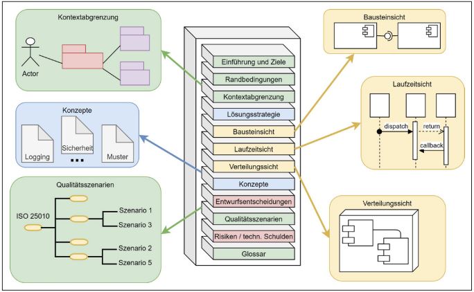 Doch die Diagramme sind nur die halbe Miete. Ohne eine sinnvolle Strukturierung und Beschreibung nutzen sie dem Betrachter der Architekturdokumentation wenig. Diesem Problem haben sich die bekannten Autoren Gernot Starke und Peter Hruschka seit mehreren Jahren gewidmet und ihre Erfahrungen in eine Vorlage gegossen, welche sie allen Interessierten auf der Webseite arc42 [Arc42] zur Verfügung stellen.