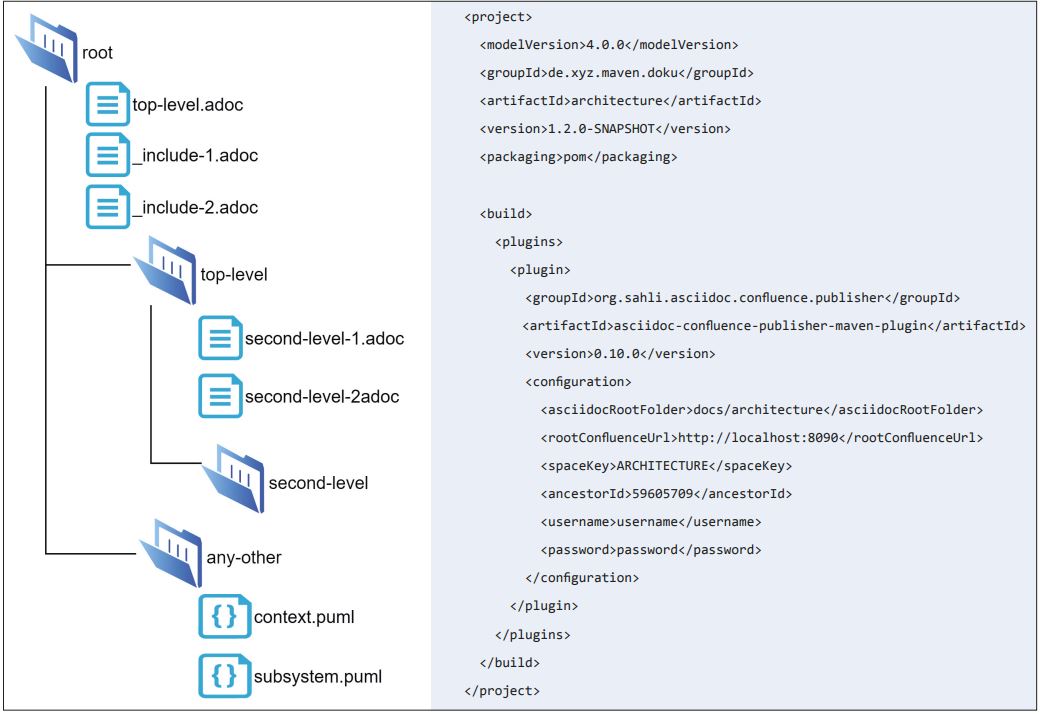 Für das oft verwendete Werkzeug Confluence existiert eine solches Bindeglied in Form des Confluence Publisher [Publisher]. Das Werkzeug kann per Hand oder über ein Maven-Plug-in gestartet werden und überträgt die eingecheckten Dokumente in ein oder mehrere Confluence-Seiten. Dazu müssen das Werkzeug konfiguriert und die Ablagestruktur der Dokumente angepasst werden. Abbildung 2 zeigt neben der Ablagestruktur die Konfiguration des Maven-Plug-ins.
