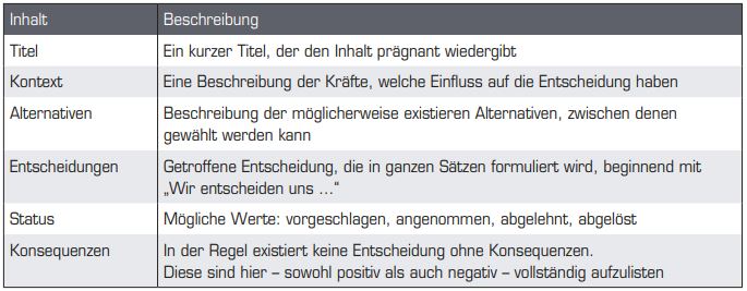 Ein sehr gutes Hilfsmittel zur Befüllung der Schublade Entwurfsentscheidungensind Architecture Decision Records, welche auf eine Idee von Michael Nygard [Nygard] zurückgehen. In Tabelle 1 sind die Inhalte der Architecture Decision Records beschrieben.