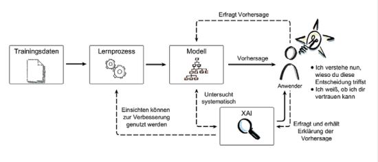 Erklärbare künstliche Intelligenz (oder Explainable Artificial Intelligence, kurz XAI) versucht die Blackbox-Problematik zu lösen, indem ein KI-Modellsystematischen Analysen unterzogen wird, welche die Entscheidungsregeln des Modells extrahieren. Das Extrakt hat den Anspruch, durch Menschen verstanden zu werden, und hilft, Vertrauen gegenüber der KI aufzubauen sowie die Qualität und Nachvollziehbarkeit zu steigern, wie Abbildung 2 verdeutlicht.