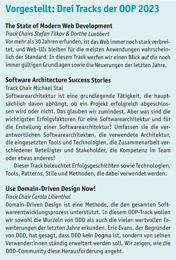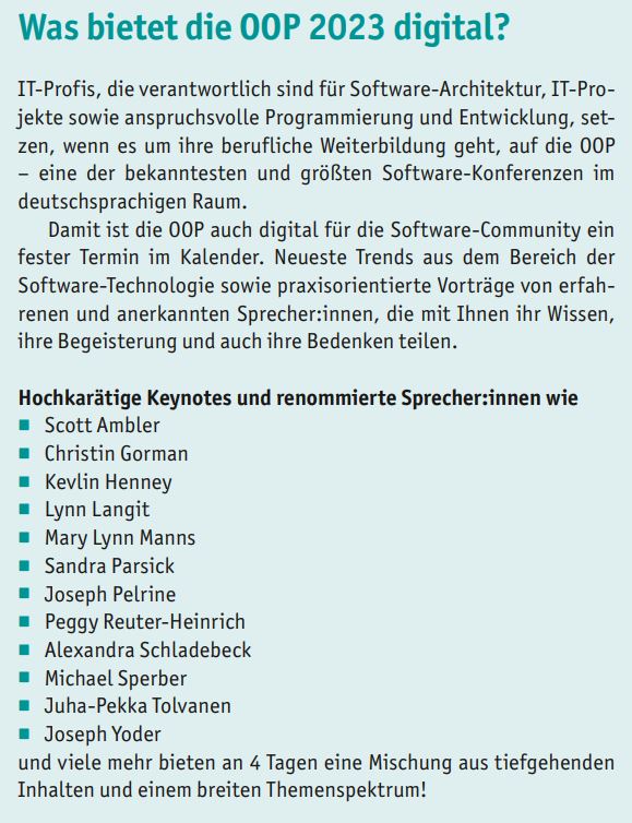 Die OOP 2023 findet vom 6. bis 9. Februar 2023 digital statt. Alle Informationen dazu finden Sie unter https://www.oop-konferenz.de/oop-2023