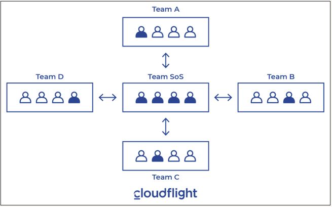 Ein gängiger Ansatz liegt in einer Erweiterung der Projektorganisation, indem eine zusätzliche Ebene eingezogen wird. Diese kann aus übergeordneten Rollen bestehen. Hierbei ist „übergeordnet” nicht notwendigerweise hierarchisch zu verstehen. Es kann sich dabei auch um bestehende Teammitglieder handeln, die sich über die aktuellen Themen abstimmen. Eine solche Vorgehensweise ist mit der Idee von Scrum-of-Scrum vergleichbar (siehe Abbildung 1).
