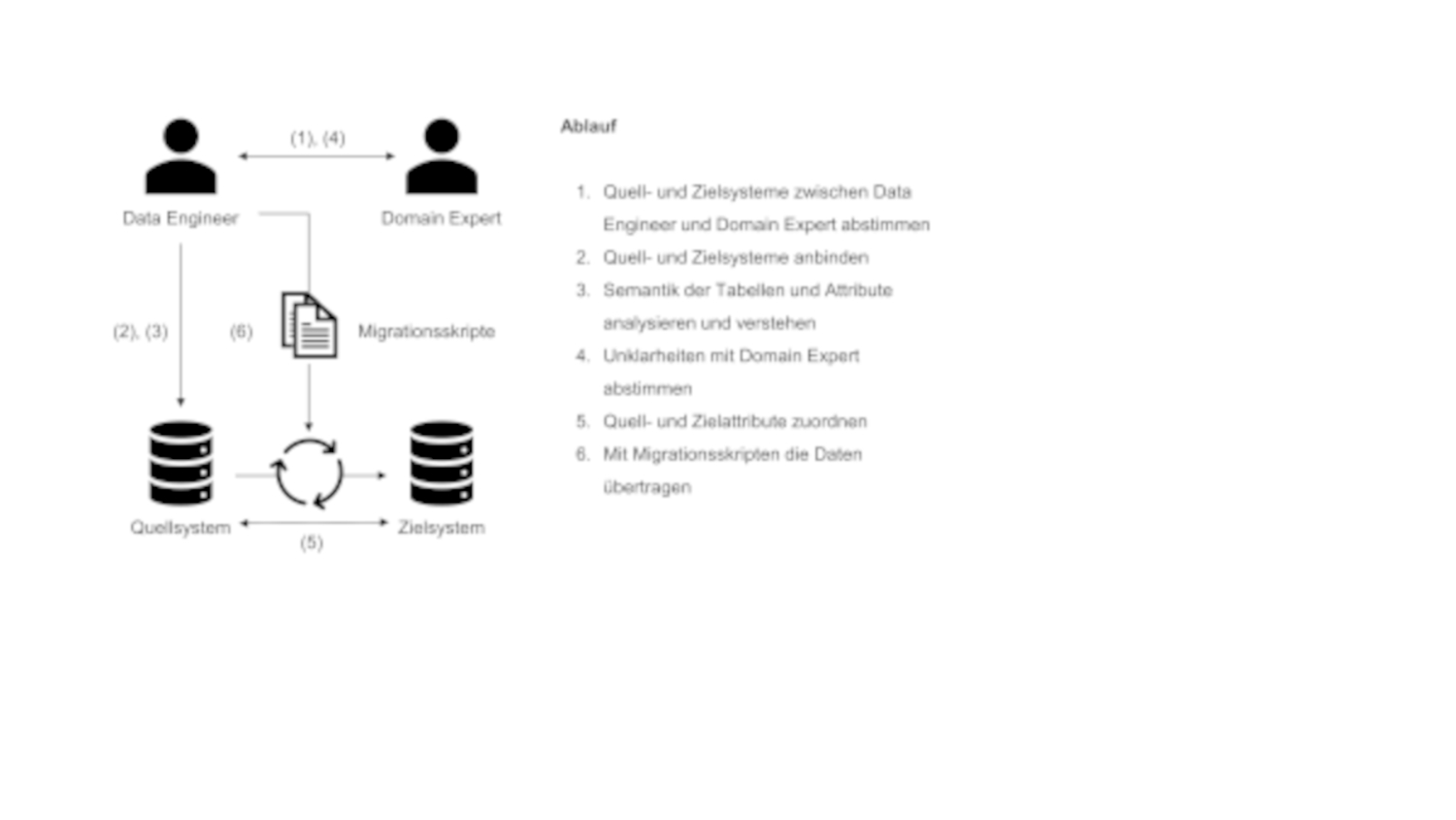 Im Allgemeinen besteht der Prozess der Datenmigration daraus, Daten aus einem oder mehreren Quellsystemen in ein gemeinsames Zielsystem zu übertragen, also zu migrieren. Die Aufgabe des Data Engineer besteht dabei darin, unterschiedlich gespeicherte, aber semantisch identische Informationen aus den verschiedenen Quellsystemen, hier Datenbanken, zu vereinheitlichen und/oder neue Informationen aus den Quellsystemen zusammenzustellen bzw. abzuleiten.