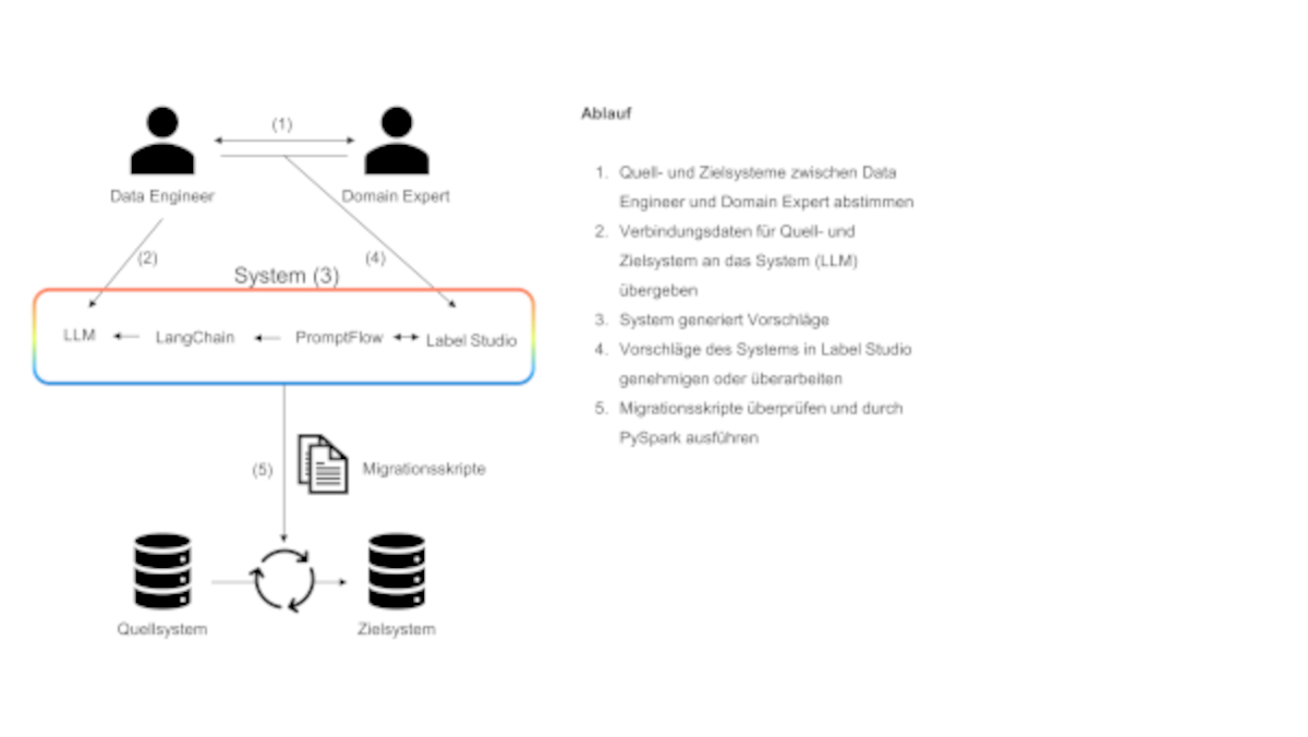 Die so gesammelten Informationen und Erkenntnisse über Quell- und Zielsysteme werden genutzt, um dem Data Engineer Vorschläge für die Datenmigration bereitzustellen, die dieser daraufhin strukturiert evaluiert und gegebenenfalls korrigiert (4). Anschließend wird das nun vollständige und korrekte Mapping von einem weiteren LLM genutzt, um den Code für die Migration zu generieren.