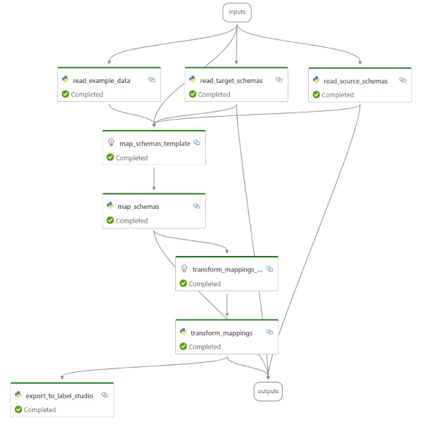 Wir nutzen Prompt Flow, um die einzelnen Verarbeitungsschritte zu Prozessen zu modellieren, darunter auch die Aufrufe des angebundenen LLM. Abbildung 3 zeigt einen Ausschnitt des Verarbeitungsprozesses: Dem LLM werden in den drei Verarbeitungsschritten read_example_data, read_target_schemas und read_source_schemas Informationen bereitgestellt, die dieses nutzt, um daraus die Zuordnungen der Quell- und Zielattribute zu erstellen (map_schemas). Die Ergebnisse werden im nachfolgenden Verarbeitungsschritt nach Label Studio exportiert (export_to_label_ studio). Damit ist dieser Teilprozess abgeschlossen.