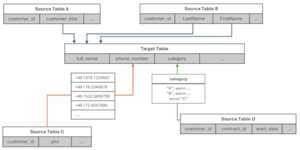 Beispielhaft sind hier drei Spalten der Zieltabelle abgebildet: full_name, phone_number und category. Im Folgenden wird anhand der drei Zielspalten jeweils der Weg der Zuordnung in die Zieltabelle beschrieben.