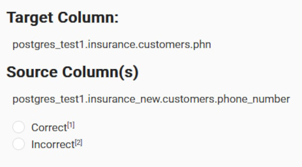 Dazu werden dem Data Engineer und dem Domain Expert für jede einzelne Zuordnung die entsprechend benötigten Quellsysteme samt Tabellen- und Attributnamen angezeigt. Sind beide mit der Zuordnung einverstanden, markieren sie diese als Correct, andernfalls als Incorrect. Bei einer als Incorrect klassifizierten Zuordnung wird diese Information mit der Begründung, warum es sich um eine fehlerhafte Zuordnung handelt, für eine Korrektur an das LLM zurückgegeben oder dem Modell wird direkt die korrigierte Zuordnung als Input für das Migrationsskript mitgegeben. Ist die Zuordnung abgeschlossen, wird das Migrationsskript von einem weiteren LLM erzeugt und ausgeführt.