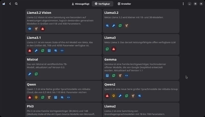 Bei mir stehen gerade direkt 138!!! Modelle zur Verfügung. Dabei haben die Modelle unterschiedlichste Eigenschaften. Welche dies sind, verraten am schnellsten die kleinen Icons unterhalb des Modellnamens. Hier findest du nicht nur Angaben über die Größe (und damit den Ressourcenbedarf), sondern auch, für welche Aufgaben und Sprachen dieses Modell trainiert wurde. Weitere Infos erhältst du auf Klick auf ein Modell.