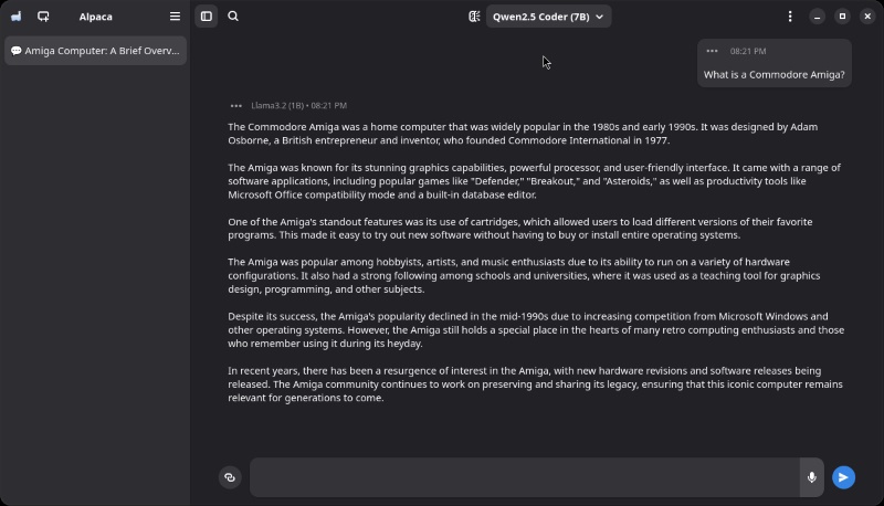 Bei Alpaca handelt es sich um eine GUI, die vor allem durch ihre Einfachheit besticht. Das soll nicht heißen, dass sie nur für einfache Arbeiten geeignet ist, sondern eher, dass sie Einsteiger nicht mit allen möglichen Optionen verwirrt, sondern sich auf die Arbeit mit einem LLM beschränkt.