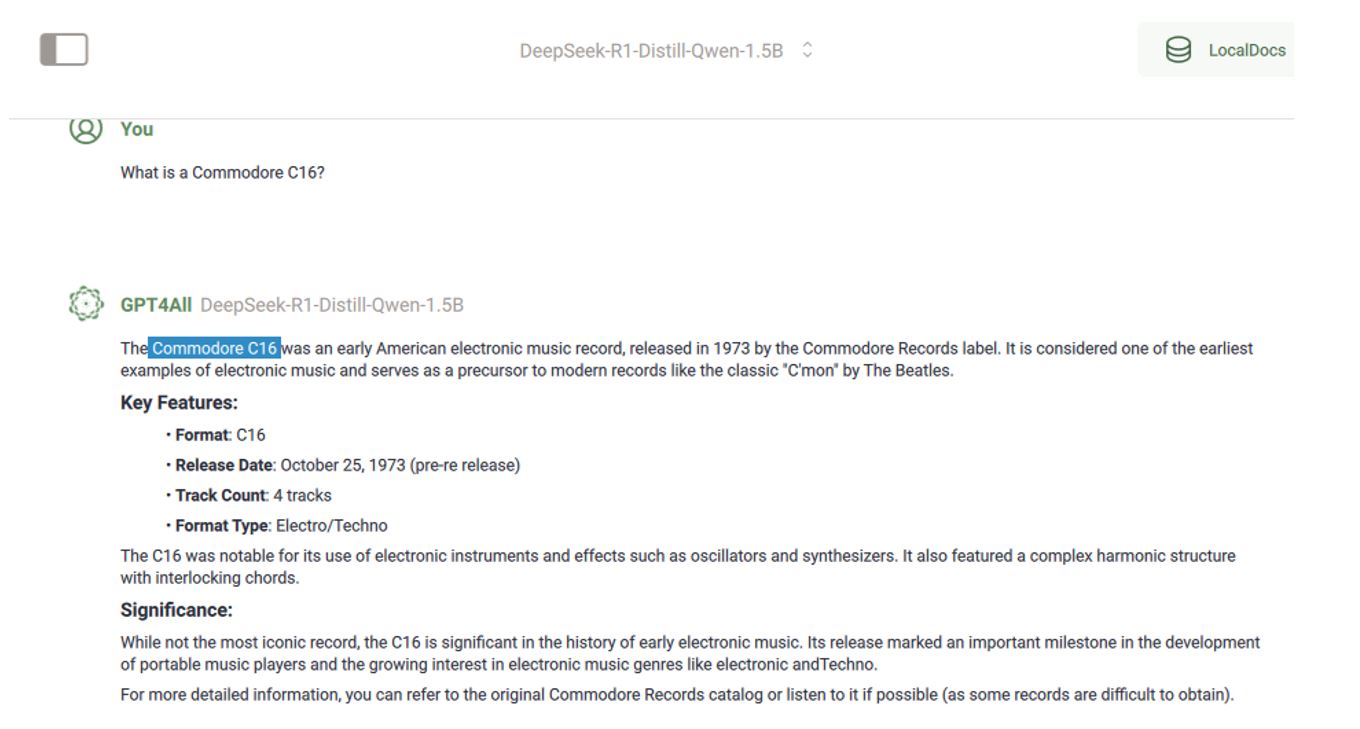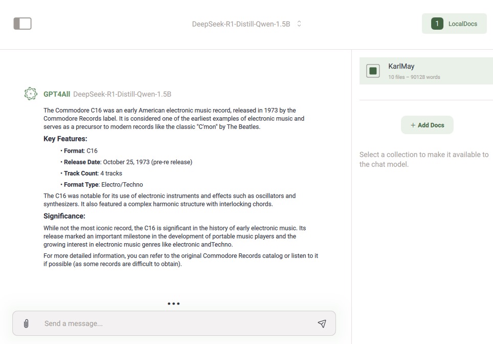 Durch Klick auf „Chat“ ist es nun möglich, sich mit dem vorher installierten beziehungsweise ausgewählten Modell zu unterhalten. Da wir ja oben schon nach dem Commodore Amiga gefragt haben, fragen wir jetzt mal nach einem Commodore C16.