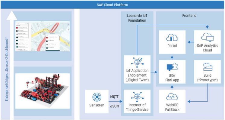 Realisiert wurde das Projekt mit SAP Leonardo auf Basis der SAP Cloud Platform. SAP Leonardo bietet Apps und Services rund um das Thema Digitalisierung; zu den bereitgestellten Technologien zählen Machine Learning, Blockchain, Big Data und Analytics. Einen Schwerpunkt des Angebots bilden IoT-Dienste (vgl. Abbildung 1). Dabei eröffnet die SAP Leonardo IoT Foundation die Möglichkeit, IoT-Szenarios selbst zu entwickeln. Im Zentrum steht dabei das „Thing Model“ des IoT Application Enablement Service, das ein logisches Abbild eines physischen Geräts ermöglicht und als Grundlage für die spätere Analyse und Anwendungsentwicklung dient. Die Verbindung von physischen und virtuellen Geräten, Sensoren und Motoren sowie die Ermöglichung der Kommunikation zwischen physischem Gerät und virtueller Repräsentation übernimmt der „IoT Service“ mit einer grafischen Oberfläche. Beide Services lassen sich dabei flexibel einsetzen und künftig in Teilen auch durch andere Bausteine austauschen (vgl. [SAP19]).