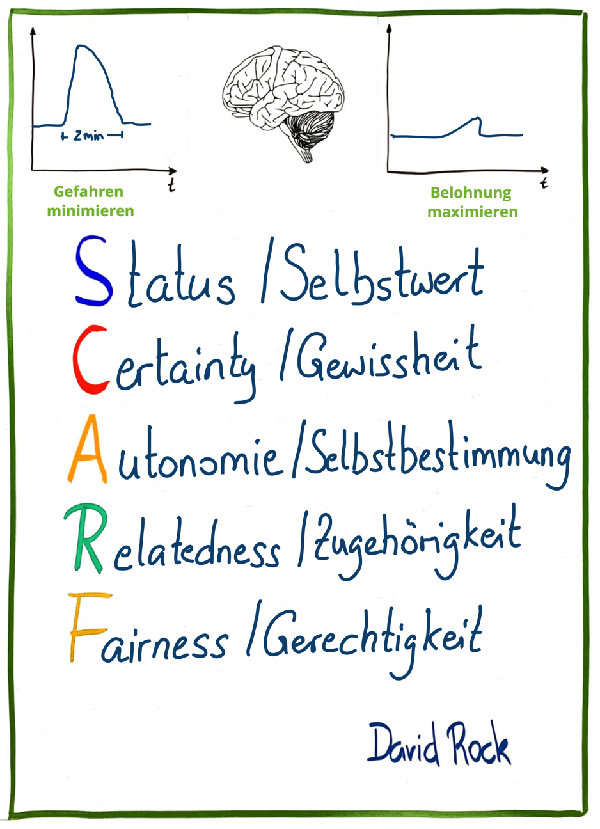 Es sagt im Wesentlichen aus, dass unser Stammhirn in Reaktionsgeschwindigkeit entscheidet, ob wir in einem Moment kooperieren oder in Widerstand gehen. Wenn zum Beispiel unser Status gehoben wird, indem wir ein ehrliches Lob bekommen oder um unsere Expertenmeinung gefragt werden, gehen wir danach automatisch in Kooperation. Wird der Status jedoch angegriffen, indem uns zum Beispiel jemand vor versammelter Mannschaft kritisiert, gehen wir automatisch in Widerstand. Die anderen vier Dinge, die wir brauchen, um kooperativ zu sein, sind nach David Rock Certainty, also Gewissheit, Autonomie, also die Möglichkeit zur Selbst- und Mitbestimmung, dann Relatedness, also Zugehörigkeit und Verbundenheit, und schließlich ist uns auch noch Fairness wichtig, also Chancengleichheit.