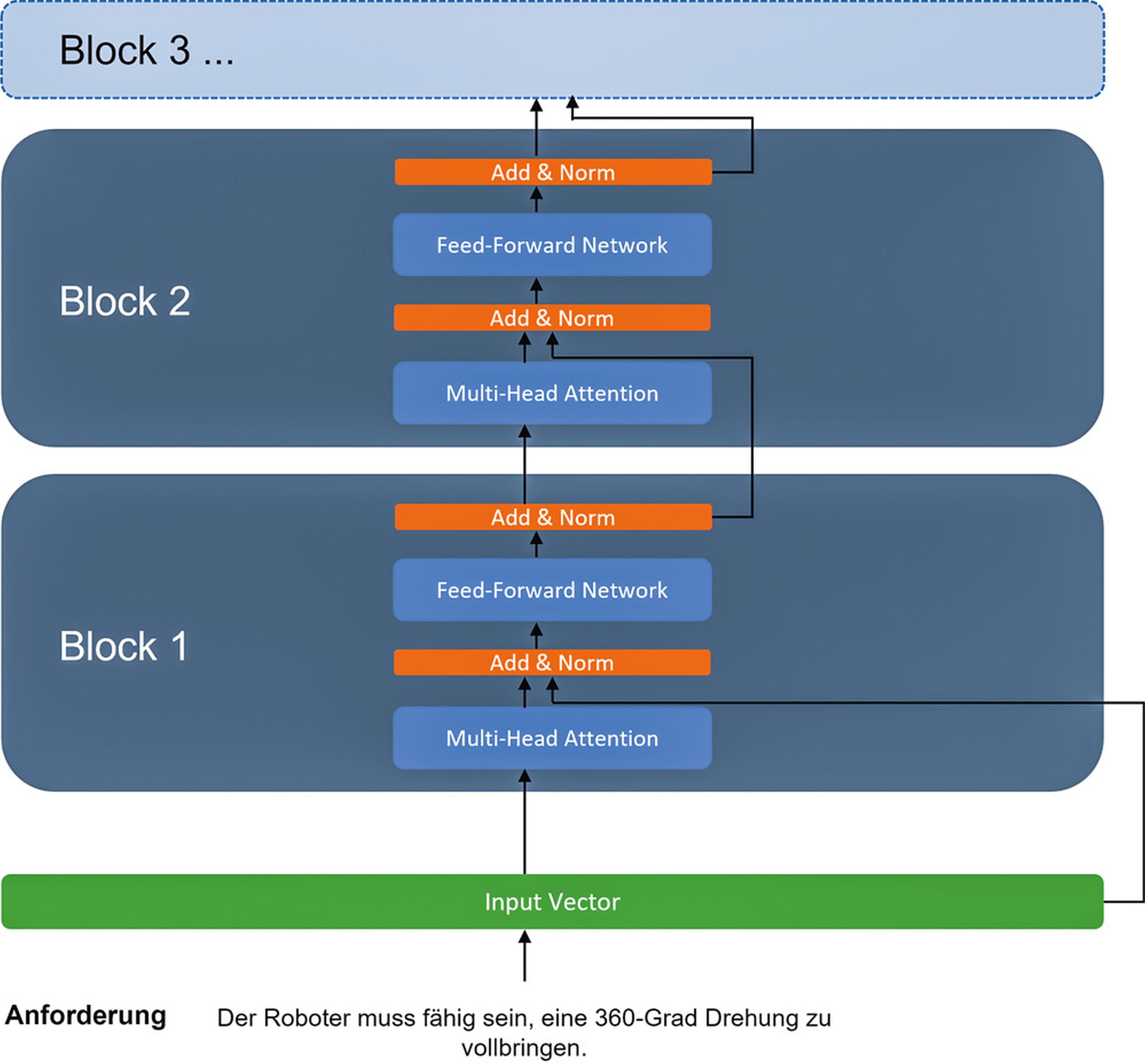 Abbildung 3 zeigt exemplarisch die Verarbeitungsschritte, welche eine Anforderung mit BERT durchläuft. Für den Anforderungssatz wird zunächst mit Verfahren aus der KI ein Vektor berechnet, welcher dann an sogenannte Blöcke weitergereicht wird. Die Architekturen der Blöcke sind identisch zueinander und bestehen jeweils aus denselben zwei KI-Modellen und einigen Funktionen zur Stabilisierung der Berechnungen. BERT ist also mehr als nur ein KI-Modell: Es kombiniert die Stärken zweier verschiedener KI-Architekturen in ursprünglich sechs identischen Blöcken, wodurch das Modell mehr und mehr über die Daten lernen kann.